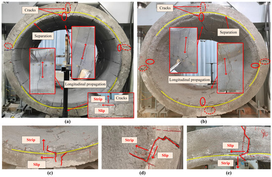Figure 8 illustrates the post-failure conditions of A-34 and B-45. Longitudinal cracks emerge on the inner surfaces of the lining around the crown and invert, whereas cracks at the springlines, originating at the interface, fail to penetrate the liner. Additionally, the damage includes separation between the host pipe and the liner. Due to gravity, separation is more pronounced on the upper side of the springlines than on the lower side. This kind of separation indicates two forms of interface failure: stripping and slipping. Stripping causes the detachment of the liner, while slippage induces misalignment between the cracks in the host pipe and those in the liner.