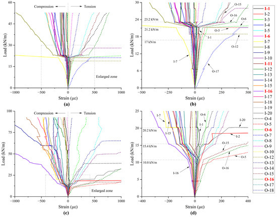 The strain variations of the repaired pipes are presented in Figure 9, with notably anomalous values excluded. Strain values at and around the critical cross-sections are highlighted. The inner surface of the liner primarily experiences compression, while the outer surface of the host pipe is predominantly subjected to tension. Around the crown and invert, this situation is reversed. When a tension crack intersects a measuring point, the strain gauge becomes damaged. Inflections in the strain curve correspond to cracking or interface failure. The strain response of the rehabilitated pipe parallels that of its pre-rehabilitated counterpart for the thin liner. In contrast, the thicker liner markedly alters the strain behavior, highlighting the influence of interfacial interactions. The elastic limit point on the load-displacement curve is a comprehensive reflection of these inflection points. As shown in Figure 9b,d, the inflection points exhibit spatial asymmetry and randomness but align with specific phases corresponding to distinct load levels. This behavior is closely associated with the interface failure process of the superposed structure.