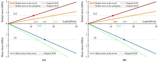 According to the advanced SCB model, the interfacial stresses at critical cross-sections are calculated using experimental data and compared with the theoretical predictions of Zhao et al. [21], as shown in Figure 10. Gravity is not accounted for in the theoretical calculations, resulting in identical stresses at the crown and invert. According to the bidirectional compression model, there is no shear at the springlines. The difference in interfacial radial stress between the two theories can be negligible, whereas the difference in shear stress is significant. As shown in Figure 9, the interfacial shear stress failure loads predicted by the proposed theory are closer to the load values corresponding to the inflection points in the strain curves (17 and 15.4 kN/m), showing more accurate calculation results.