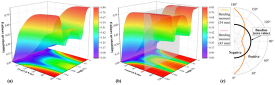 Upon debonding between the host pipe and the liner, each structural component independently resists external loads. To validate the load redistribution process, it must first be demonstrated that the liner and host pipe jointly bear the external load before interface failure. The measured bending moment is calculated using internal and external strain values, as expressed in Equation (27). Verification is directly achieved by comparing the measured bending moment with the theoretical one. For this analysis, strain values at the 90° position of A-34 are used, and the results are presented in Figure 14a. Before the interface at the springline strips, the theoretical and measured bending moments show good agreement.