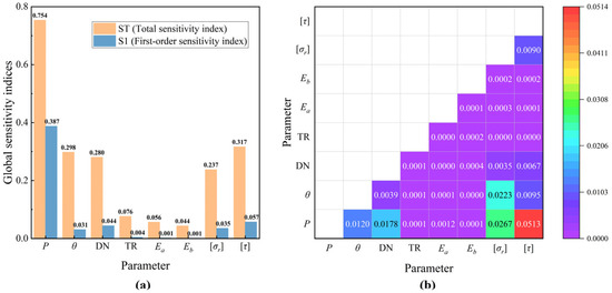 Moreover, as the failure criterion incorporates an excessive number of parameters, essential factors must be identified to inform engineering applications. To identify the primary factors influencing interface failure, sensitivity analysis can be performed. Sobol global sensitivity analysis, known for its comprehensive and explanatory nature in uncertainty quantification, employs a variance-based Monte Carlo sampling to decompose the output variance of a model into contributions from individual input variables and their interactions, quantifying each variable’s impact on the output [25]. First-order and second-order sensitivity indices quantify the contribution of a single input variable and the interaction between two variables to the output variance, respectively. The total sensitivity index accounts for the total contribution of an input variable to the output. For independently and identically distributed input variables X1, X2, …, Xk, the model output is a function of these input variables, i.e., Y = f(X1, X2, …, Xk). Each index is calculated as shown in Equations (14)–(16), and the sensitivity can be assessed by comparing the relative magnitudes of the indices for each input variable.