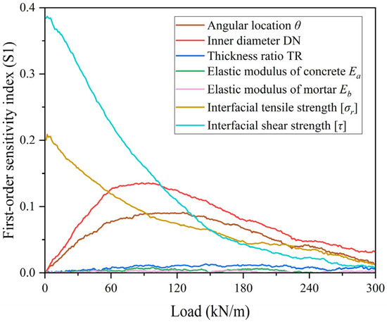 Bending moments caused by external loads are the primary cause of interface failure, the magnitude of which depends on pipe diameter and spatial positioning. Among the material properties, the interfacial strength is the most critical, with its sensitivity significantly higher than that of thickness and elastic modulus. The elastic moduli have the least effect on interface failure, allowing the reduction in elastic modulus due to the cracking of the host pipe to be neglected. Further analysis reveals that the sensitivity of interface strength to pipe diameter and angle varies with loading conditions, as shown in Figure 13. In general, interfacial strengths, particularly shear strength, play a dominant role. Their effect decreases with increasing load, while the sensitivity to diameter and angle exhibits a maximum value. For a larger diameter RCP, the interface failure load increases, and the influence of interfacial strength on failure becomes less significant. Only at very high loads does the sensitivity of wall thickness and elastic modulus narrow the gap with other parameters. Efforts should focus on increasing the interfacial strengths to prevent interface failure.