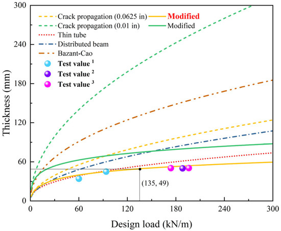 At the last stage, the repaired pipe becomes a “pipe-in-pipe” structure with almost global failure at its interface. The liner and the host pipe carry separate loads, and the bearing capacity of the repaired pipe depends on their individual capacities. Generally, the liner can no longer carry the load when cracking is severe, at which point the host RCP may not have reached plastic failure yet. In limit state design, the residual bearing capacity of the host pipe, which is mainly influenced by pre-rehabilitation load, becomes the determining factor. However, this parameter remains difficult to quantify. Therefore, the bearing capacity of the mortar lining is typically adopted as the design criterion, with spray thicknesses determined accordingly. Royer et al. [44] summarized commonly used design models, including those based on crack width, as shown in Table 4. However, the crack propagation model relies on the original theory of crack width, without considering the influence of interface failure. Based on the result of load redistribution, the external load is discounted, and the crack propagation model is modified in this paper. The comparison of these design models with the tested ultimate loads is illustrated in Figure 16.