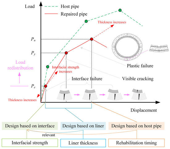Figure 17 illustrates the failure process of mortar-lined RCPs, highlighting the crucial role of interface. Interface failure leads to accelerated cracking and damage of the repaired pipe. The elastic limit load represents the combined effect of interface failure at all angular orientations. Increasing the elastic limit load delays the load redistribution and ultimately enhances the bearing capacity. Therefore, interface design is a critical component of SAPL design, with an emphasis on improving interfacial strengths rather than increasing liner thickness. For example, if the interfacial shear strength is 4 MPa, the elastic limit load can reach approximately 45 kN/m. To achieve this effect, the interfacial strengths can be improved through methods such as chiseling, installing rebars and applying interfacial agents. Additionally, advanced spraying construction techniques should be employed to control thickness uniformity and reduce interface failure probability. Only after interfacial improvements can the liner thickness be optimally calibrated to balance performance and cost. Since the residual bearing capacity is closely related to the damage extent of the host pipe, the rehabilitation timing becomes an important factor in limit state design. Timelier rehabilitation preserves the integrity of the host pipe, enhancing its post-rehabilitation strength.
