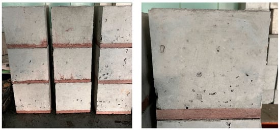 View of composite specimens—15 mm damping subbase layer (colored red) and 135 mm C35/45 XM2 industrial topping layer.
