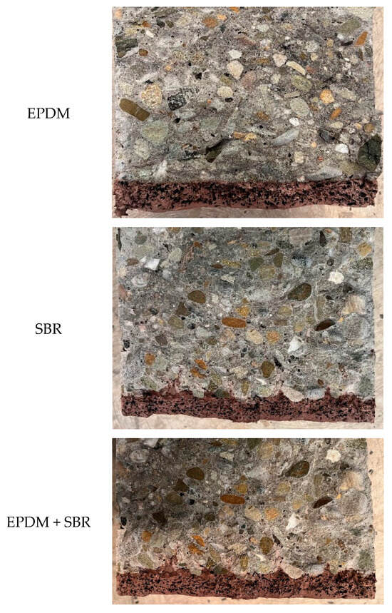 After the Schmidt hammer test, the composite specimens were split to assess the uniformity of rubber granulate distribution within the damping layer (Figure 3).