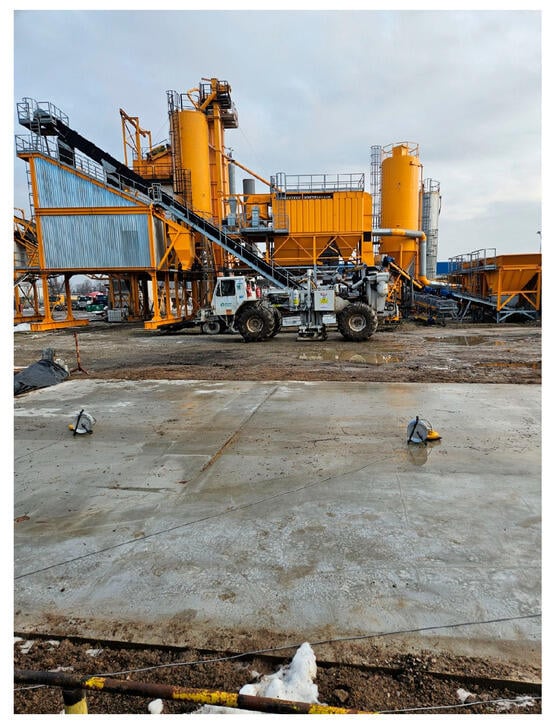 Analogous full-scale trials were performed for the lean subbase concrete. The concrete mix was delivered from the ready-mix plant (RMC), where a pumping test was conducted, and the consistency was assessed 10 min after the first contact between cement and water. The mix was then transported to the laboratory, where its rheological properties were evaluated (slump test and flow spread), followed by the casting of cube specimens for compressive strength testing.