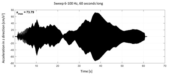 The recorded time-domain signals reflect the complex dynamic response of each slab configuration to the frequency-sweep excitation (see Figure 7), which involves a continuous change in frequency over time rather than a single harmonic input. This type of excitation allows for a broader assessment of the system’s behavior across the entire tested frequency range. Comparing the amplitude levels in the recorded signals enables direct evaluation of the effectiveness of the vibration-isolating layers in reducing vertical vibrations.