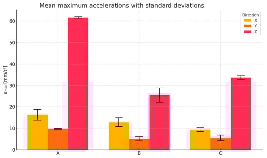 To compare the vibration response of the three tested floor systems, the mean maximum acceleration values (amax) recorded in the X, Y, and Z directions were analyzed. The results, obtained from three repetitions of each measurement, are presented in Figure 8.