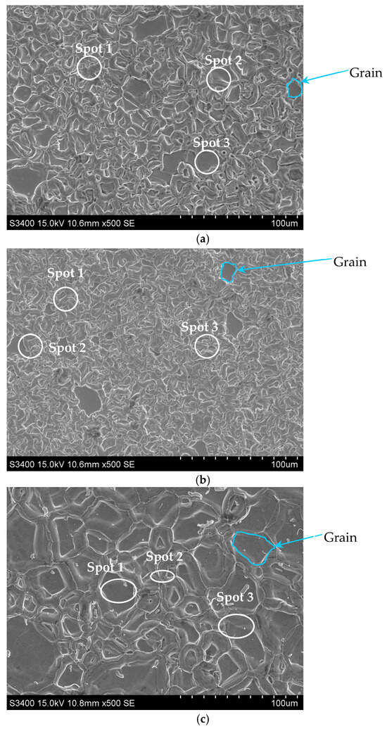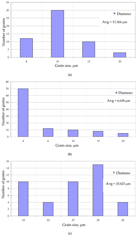 The surface morphology with EDS spectrum results of the aluminide coatings deposited on IN713, IN625, and CMSX4 is shown in Figure 2a–c and Table 2, Table 3 and Table 4. The size of the grains was determined from SEM images by using grain size histograms, as shown in Figure 3. The fine-grain structure of the coatings’ surfaces was observed. The average grain diameter on the surface of the IN713 superalloy coating was ca. 12 µm, whereas the average grain diameter on the surface of the IN625 superalloy coating was ca. 7 µm—slightly smaller than that on the IN713 superalloy coating. The average grain diameter on the surface of the CMSX4 superalloy coating was ca. 25 µm. The coating comprised mainly aluminum, nickel, and a small amount of the elements that were in the substrate: molybdenum and chromium (IN713); chromium and iron (IN625); or cobalt and chromium (CMSX4). The aluminum and nickel contents on the surface of the coatings indicated the presence of a β-NiAl phase (Table 2, Table 3 and Table 4).