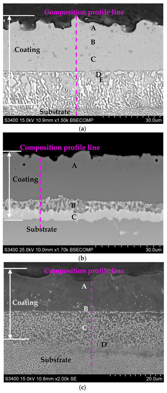 The interdiffusion layer located under the outer one was composed of precipitate phases enriched with refractory elements that diffused from the substrate. High chromium concentrations (71 and 81 at.%) were identified in the interdiffusion layer of the coatings on the IN713 and IN625 substrates, respectively (Figure 4a,b, Table 5 and Table 6). Furthermore, the precipitated phases in the interdiffusion layer are, probably, Cr23C6 carbides [35], while chromium (12 at.%), tungsten (11 at.%), and rhenium (5 at.%) were mainly identified in the interdiffusion layer of the coating on the CMSX4 substrate (Figure 4c, Table 7). The precipitated phases in the interdiffusion layer are, probably, topologically close-packed (TCP) phases [36].