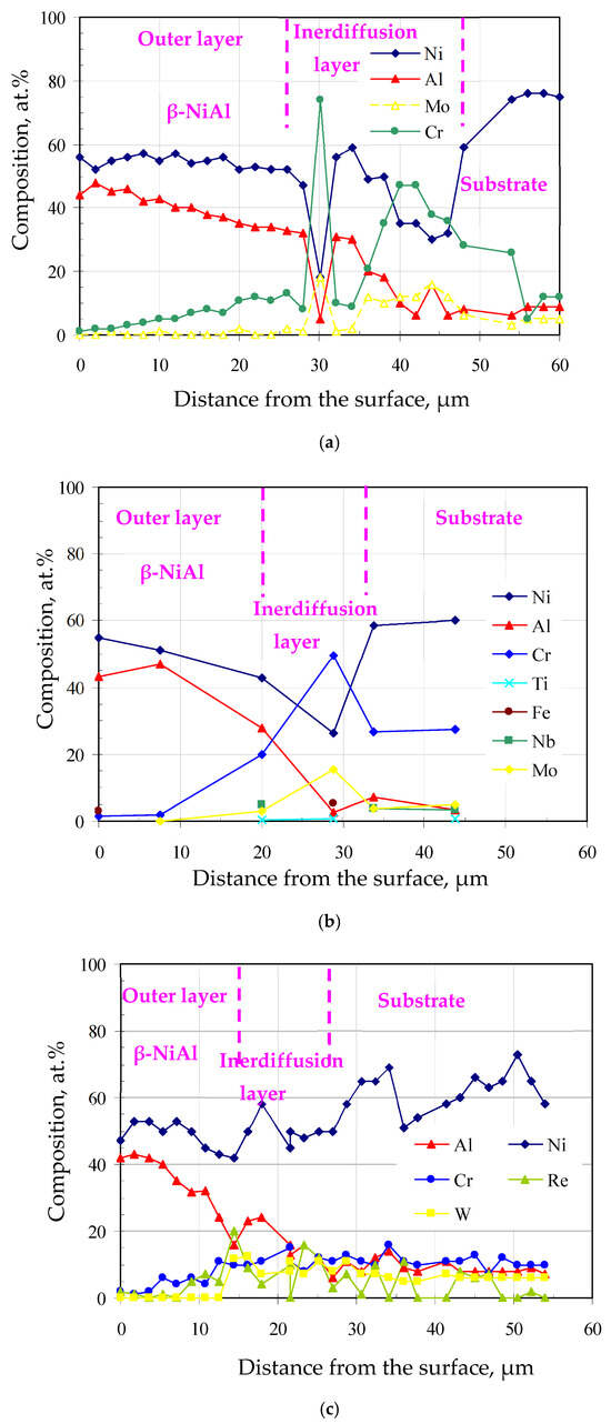 The chemical composition profiles on the cross-sections of the aluminide coatings are shown in Figure 5a–c. The aluminum content decreased from the outer layer to the substrate, while the nickel content was nearly constant in the outer layer and decreased in the interdiffusion layer. Moreover, the chromium concentration in the outer layer of the coatings was much lower than that in the interdiffusion layer. This is as a result of the lower outward chromium diffusion rate in the NiAl phase formed during aluminizing [37].