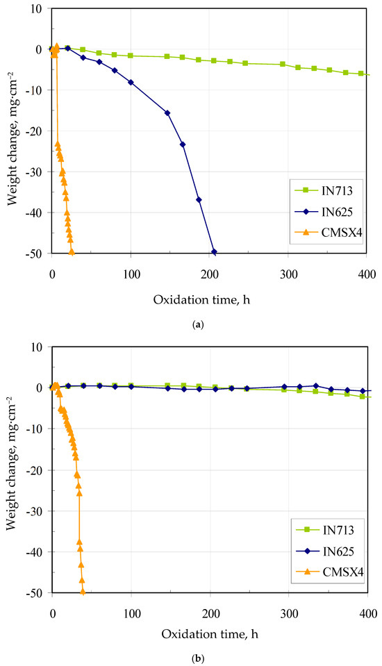 Weight change curves of the bare and coated superalloys are shown in Figure 8a,b. The weight change of bare superalloys decreases just after 40 h of oxidation. This is due to the scarce protective properties of the scales formed on their surface. The worst lifetime and rapid weight loss were found for the bare CMSX4 superalloy. Similar oxidation kinetics were observed for the PWA 1480 single-crystal superalloy with 8–10 ppm of sulfur [40]. Sulfur is present in superalloys as an impurity in raw materials and at each step of the superalloy processing [40]. During oxidation, sulfur segregates at the oxide/superalloy interface and accelerates the growth of voids and cracks, which results in a reduction of adhesion of the oxide scale to the superalloy [40,41]. Smialek et al. [42] found that reducing the content of sulfur from 10 to 1 ppm in a single-crystal superalloy can greatly improve its cyclic oxidation resistance. The removal of sulfur may be achieved by repeated oxidation and polishing, high-temperature annealing in vacuum or desulphurization in hydrogen at high temperature. The removal of sulfur improves the oxidation resistance of the superalloy [40]. CMSX4 has the highest titanium content among the investigated superalloys. According to Meier et al. [43], the addition of 1 wt.% titanium improves the oxidation resistance of FeCrAl alloys. However, the addition of a similar titanium amount to nickel superalloys does not have a comparable effect. Titanium increases the growth rate of Al2O3 and has a detrimental effect on scale adhesion on nickel-based superalloys. On the other hand, Younes et al. [44] described the oxidation behavior of the CMSX4 superalloy at 1100 °C in the air up to 100 h. The scale consisted of two layers: upper and inner. The upper layer consisted of spinel (Ni,Co)Al2O4 and (Ni,Cr)2O4, the inner layer—of α-Al2O3. The lifetime of IN625 was higher than that of CMSX4 but lower than that of the IN713 superalloy. Rolland et al. [45] oxidized the IN625 superalloy at 1100 °C in the air. The oxidation rate and scale composition were evaluated. The oxides were composed of an outer chromia scale and an internal CrNbO4 subscale. Moreover, some oxide spallation was observed, probably due to molybdenum oxidation, leading to MoO3 scale evaporation and void formation at the internal interface. The best lifetime and slow weight loss were found for the bare IN713 superalloy. Lee [46] performed oxidation of the IN713 superalloy at 1100 °C in the air up to 100 h. Excellent oxidation resistance was observed. Only a few micrometer-thick scale was observed after oxidation. The scale consisted mainly of α-Al2O3, with a small amount of TiO2, NiAl2O4, and Cr2O3.