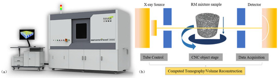 Images of the internal structure of the RM were obtained by X-ray computed tomography (CT) scanning. The CT scan used in this study was a nanoVoxel-3000 series open-tube transmission high-resolution system (Sanying Precision Instruments Co., Ltd., Tianjian, China), and a picture of the scanner and its working schematic are shown in Figure 2. Radial and axial cross-section images with a resolution of 0.5 μm were generated using a scanning voltage of 60 kV and a current of 30 μA. The obtained CT images were thresholded and segmented, and Figure 3a shows an example of radial images obtained from the CT scan [35]. In these images, the white areas represent RM aggregates and the black parts represent voids and exteriors.