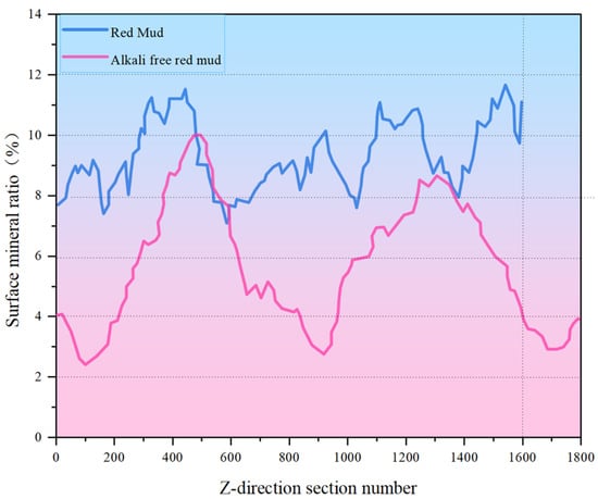 Comparing Figure 6 and Figure 7, it was obvious that the particle size of RM particles becomes larger after dealkalization, and the number of small-sized minerals decreases. This is confirmed by the mineral sieve diameter distribution diagram of the original and low-alkalinity RM, which shows a significant reduction in minerals with an equivalent diameter of less than 50 μm after dealkalization. This is due to the fact that during the dealkalization process, the dissolution of CCS produces Ca2+ that can replace Na+ and Mg2+ in the RM. Figure 8 demonstrates the changes in the distribution of minerals along the height direction of the specimen in the original RM and the low-alkalinity RM. The mineral proportion in the original RM fluctuates greatly in the Z direction, that is, there is a large heterogeneity in the RM at the micro-scale, while the mineral distribution in the low-alkalinity RM is generally uniform. It can be seen from the comparison in the figure that the number of minerals with low-alkalinity RM at the same height is less than that of the original RM sample, which may be due to the agglomeration of small mineral particles during the dealkalization process of CCS, which reduces the number of minerals. This is consistent with the findings of Dai et al. [37], who found that Ca (OH)2 in CCS can react with RM to form gel products, thereby increasing the volume of mineral particles.