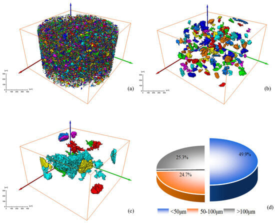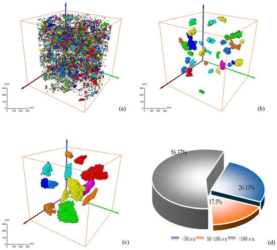 Screening and statistical analysis of minerals in CT images of original RM: (a) sieve diagram with equivalent diameter ≤ 50 μm; (b) sieve diagram with equivalent diameter 50~100 μm; (c) sieve diagram with equivalent diameter > 100 μm; (d) mineral volume percentage pie chart.