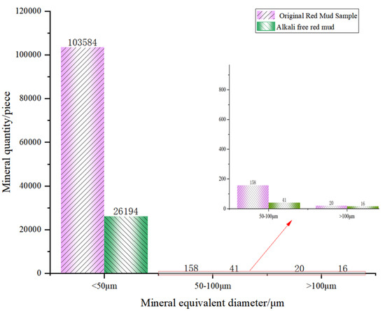 Figure 9 and Figure 10 show the volume percentage of mineral particles further sieved and obtained for different equivalent diameter minerals of the original RM and low-alkalinity RM, respectively. Figure 11 provides further statistics and supplementary information on the results shown in Figure 9 and Figure 10. It presents mineral screening statistics for different particle sizes (<50 μm, 50~100 μm, and >100 μm) of raw RM and low-alkalinity RM, providing a more comprehensive view of changes in the particle sizes of RM during the dealkalization process. After dealkylation, the mineral particles with three different equivalent particle size ranges in RM are reduced. The total number of mineral particles in the low-alkalinity RM is less than the original RM, and the mineral particles with a particle size < 50 μm decreased the most, while the mineral particles with an equivalent particle size > 100 μm decreased the least. This indicates that the dealkalization process may promote the aggregation or dissolution of particles, thus reducing the total number of particles. And the number of mineral particles with a diameter < 50 μm decreased the most in all particle size ranges, indicating that smaller particles are more likely to react in the process of dealkylation. As can be seen from the pie chart of mineral volume ratios, the volume of particles with an equivalent diameter larger than 100 μm increased greatly after the dealkalization treatment of CCS, accounting for 56.37% of the total volume, which is due to the aggregation or sedimentation of particles during the dealkalization process.