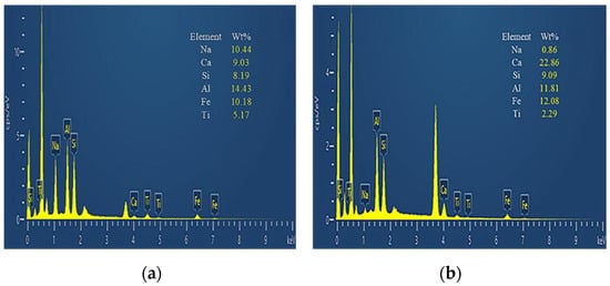 In general, the high porosity of the original RM and a large number of small particle minerals will reduce the strength and durability of the material, and the strong alkalinity of RM will pollute the soil and water. In contrast, the alkalinity of RM after CCS treatment is reduced, and the mineral distribution is more uniform. While the number of small particle size mineral particles is reduced, the number of large particles is increased, and the overall porosity of the material is reduced. In order to further observe the changes in the particle distribution and mineral composition of RM minerals after dealkalization, SEM-EDS analyses are carried out on the RM specimens before and after dealkalization. The results are shown in Figure 12 and Figure 13. From the EDS image, it can be seen that the Na+ content in RM decreased from 10.44 wt% to 0.86 wt% after dealkalization, with an alkali removal rate of approximately 91.76%, and the Ca2+ content increased from 9.03 wt% to 22.86 wt%, which proves that Na+ is replaced by Ca2+ in low-alkalinity RM. Compared to the dealkalization effect of traditional calcium-based materials, CCS has a good dealkalization effect on RM [38,39]. From the SEM image, it can be seen that the surface of RM before dealkalization is rough and porous with uneven distribution of elements, while the surface of low-alkalinity RM is relatively smooth and more uniform in elements. Therefore, the alkalinity of RM is reduced after CCS dealkalization treatment, and it helps to improve its performance and application value.
