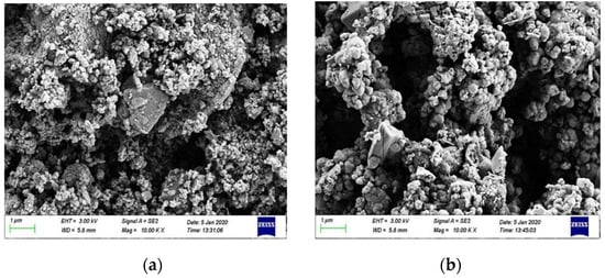 SEM analysis (2000×, 5000×, and 20,000×) was performed on the crushed samples to characterize the microstructure of the hydration products under the microscope, and energy-dispersive spectrometry (EDS) analysis was performed on the RM before and after dealkalization to study the changes in elemental composition.