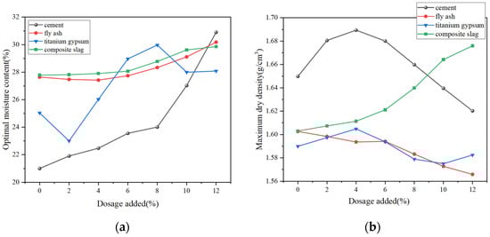 Compaction characteristics of stabilized low-alkalinity RM: (a) OMC values of samples with different dosages; (b) MDD values of samples with different dosages.