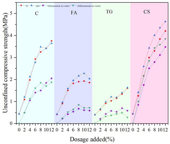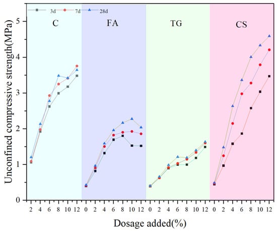 Figure 15 shows the UCS values of the samples at 3 d, 7 d, and 28 d under different dosages of stabilization material. It can be seen that compared to the unstabilized low-alkalinity RM material, C, CS, TG, and FA, as stabilization materials, have an obvious stabilization effect, and the UCS values of the specimens are increased to different degrees with the increase in the age of maintenance. When the curing time was 28 d, the UCS values of the specimens with 12% stabilization material, respectively, increased by 350%, 800%, 230% and 216%, compared to the control group. As the amount of cement used increases, the ucs value of the sample gradually increases, which is consistent with the research conducted by Cen et al. [22]. When C was used as stabilization material and cured for 7 d, the reaction between RM and C was almost completed, which is related to the rapid hydration reaction of cement in the early stage [40]. Therefore, the UCS values of the specimens did not change greatly with the increase in curing time.