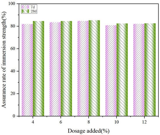 To meet the requirements for construction and road use, the material must possess a certain level of stability. Specifically, the change in its UCS value under submerged conditions should be within a defined range. Figure 17 shows the immersion strength guarantee of CS stabilized low-alkalinity RM at the same curing time and dosage. From the results, it can be seen that the 7 d strength assurance rate of using CS to stabilize low-alkalinity RM is between 81% and 85%, and the 28 d strength guarantee rate is between 82% and 86%. It indicates that the stability effect of CS on low-alkalinity RM gradually increases with the increase in curing time. Moreover, the low-alkalinity RM materials stabilized by CS had the highest guaranteed immersion strength and the best resistance to water damage compared to other materials. It is further shown that CS is the best stabilization material for low-alkalinity RM.
