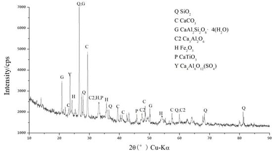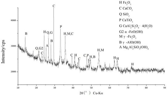 Figure 18 shows the XRD spectra of the original RM samples after dealkalization. From the figure, it can be seen that the main elements in the low-alkalinity RM are Fe, Al, Ca, Si, and Ti, and its main physical phases are Fe2O3, aluminum goethite, ilmenite, SiO2, CaTiO3, grossular (Ca3AlSi3O12), and goethite (α–FeO(OH)).
