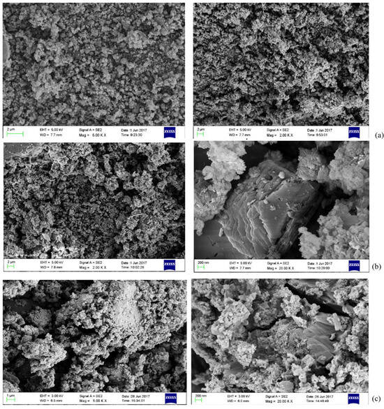 SEM images: (a) low-alkalinity RM; (b) low-alkalinity RM cured for 7 d; (c) low-alkalinity RM cured for 28 d.