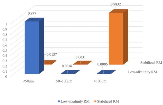 The characteristics of mineral particles before and after stabilization of low-alkalinity RM were compared using a CT scan. Figure 22 shows the proportion of mineral volume in the low-alkalinity RM material after stabilization treatment. From the figure, it can be seen that the volume of mineral particles with diameters larger than 100 μm increases, accounting for 98.32% of the total volume, i.e., the material as a whole is well agglomerated, with a small number of loose particles. This is consistent with the results of SEM and EDX analysis of the material, thus further suggesting that larger agglomerates generally result in better physical stability of the material.