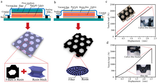 The forming of carbon fiber triaxial woven fabric composites. (a) Resin transfer molding. (b) Resin film infusion molding. (c) The tensile load–displacement of resin transfer molding. (d) The tensile load–displacement of resin film infusion molding. Note that the blue and black arrows in a and b represent directions of resin and air, respectively. The white circles in c and d represent damages of composites.