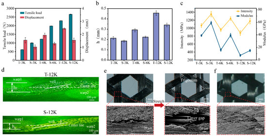 Tensile properties of carbon fiber triaxial woven fabric composites. (a) Tensile load–displacement, flexural wave height (b), and intensity modulus (c) of different composites. (d) Cross-section of T-12k and S-12k. (e) Fiber sliding and delamination of T-12k. (f) S-12k in stretching.