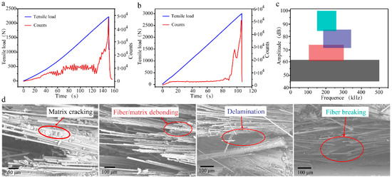 Acoustic emission signals and failure modes. (a) AE counts of T-12k. (b) AE counts of S-12k. Four types of acoustic emission signals (c) and corresponding damages of composites (d).