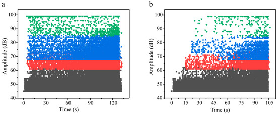 As evidenced in Figure 4, both conventional carbon fiber triaxial woven composites (T-12k) and their spread yarn counterparts (S-12k) exhibited continuous resin fracture events throughout the entire tensile loading process until final material failure, where black, red, blue, and green markers, respectively, denote matrix cracking, fiber/matrix debonding, delamination, and fiber fracture signals. The key distinction lies in the significantly higher frequency of fiber–matrix debonding and yarn delamination events in conventional T-12k composites, along with the persistent occurrence of fiber fracture signals from initial to final loading stages despite their relatively low overall proportion. In contrast, spread yarn composites (S-12k) demonstrated delayed onset and substantially reduced occurrence of these critical failure modes—fiber–matrix debonding, yarn delamination, and fiber fracture signals predominantly emerged immediately preceding ultimate failure. This temporal shift in damage progression reveals that the extensive fiber–matrix debonding and delamination in T-12k composites actively promoted premature fiber fracture, whereas the optimized architecture of S-12k composites effectively postponed fiber failure until the advanced loading stages, highlighting the superior damage tolerance achieved through yarn spreading modification.