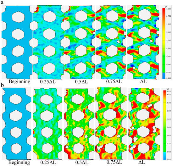 Given that the failure mode of carbon fiber triaxial woven fabrics changed after yarn spreading, and the slippage and delamination failure between fibers mainly occurred at the interweaving points, we can use optical measurement methods to monitor the strain at various locations of the fibers in real time during the stretching process. At the beginning stage of stretching for original carbon fiber triaxial woven fabrics, the strain of the specimens tended to be in a stable state, and the degree of strain that occurred was relatively small. With the continuous increase in the load, the strain at different positions on the material surface gradually varies. The interweaving points of the triaxial woven fabrics were the areas where the material strain was the greatest (Figure 5a). However, the strain in other areas outside the interweaving points was also obvious in the carbon fiber triaxial woven fabrics after yarn spreading (Figure 5b). That was because the fibers in the material were straightened more after yarn spreading and weaving, with smaller buckling at the interweaving points. During the stretching process, the fibers can better resist external forces in coordination, and the slip generated at the interweaving points is smaller.