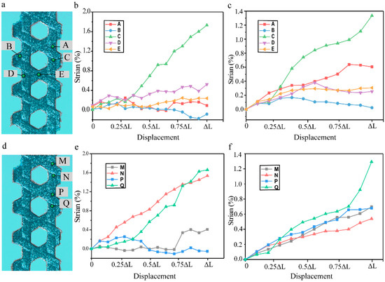 The strain at different points on the composites. (a) The selection points around the hexagonal holes of T-12k (b) and S-12k (c). (d) The selection points in vertical direction of T-12k (e) and S-12k (f).