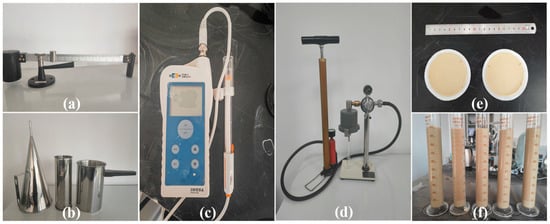 Experimental instruments: (a) NB-1 mud balance, (b) marsh funnel, (c) PHB-4 portable pH meter, (d) ZNA-2A filter press, (e) filter cake and caliper, (f) 1000 mL graduated cylinder.
