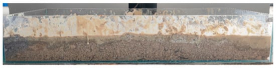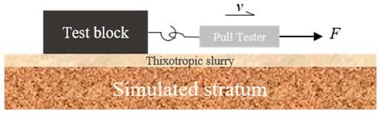 The experiment utilized test blocks with identical bottom surface roughness and geometric dimensions (mass set at 1, 1.5, and 2 units), which were placed on the surface of a pre-established slurry–stratum model, as shown in Figure 4, the schematic diagram of the slurry–stratum interface friction test model, and Figure 5, the side view of the slurry–stratum structure. A pull tester was employed to pull the test blocks at a constant speed. Once the test data stabilized, readings were recorded, with ten sets of valid data collected for each mass gradient. The resulting dataset enabled generation of friction force versus normal stress scatter plots, from which interfacial friction coefficients and adhesion forces were derived via linear regression analysis.