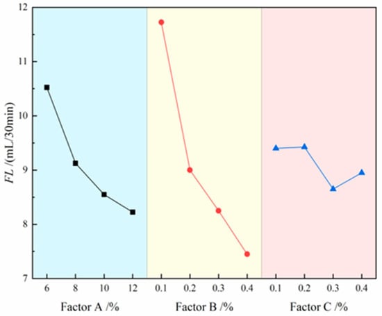 The contribution effects of three factors on FL are illustrated in Figure 7, where the four level values of each factor are represented on the x-axis and the FL values are indicated on the y-axis. The analysis results demonstrate that the degree of influence of each factor on slurry FL follows the following order: CMC > bentonite > Na2CO3. Specifically, FL shows a significant decreasing trend with increasing CMC and bentonite content, while it initially decreases and then increases with rising Na2CO3 content. The range analysis in Table 6 further confirms this conclusion, with the range values ranking as follows: CMC (R = 4.275) > bentonite (R = 2.3) > Na2CO3 (R = 0.775). Notably, FL exhibits a negative correlation with slurry performance, meaning that lower FL corresponds to better slurry performance. Therefore, when optimizing the slurry formulation, priority should be given to increasing the dosage of CMC and bentonite, while the Na2CO3 content needs to be controlled within an optimal range to achieve the best slurry performance. Ultimately, under the dual criteria of maintaining FL below 25 mL/30 min and prioritizing minimal values, the optimal combination for minimizing slurry fluid loss was determined to be A4B4C3.