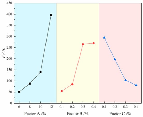 The contribution effects of three factors on FV are illustrated in Figure 8, where the four level values of each factor are represented on the x-axis and the FV values are indicated on the y-axis. The analysis results reveal that the degree of influence of each factor on slurry FV follows the following order: bentonite > CMC > Na2CO3. Specifically, FV shows a significant increasing trend with rising bentonite and CMC content, while it exhibits a clear decreasing trend with increasing Na2CO3 content. The range analysis in Table 7 further confirms this conclusion, with the range values ranking as follows: bentonite (R = 343.75) > CMC (R = 215.5) > Na2CO3 (R = 213). Notably, bentonite demonstrates the most pronounced effect on FV enhancement, as evidenced by its significantly higher range value compared to other factors, indicating its dominant role in regulating slurry viscosity. Although CMC and Na2CO3 show relatively smaller effects, their influence remains non-negligible. Ultimately, the A3B2C3 formulation was identified as the optimal composition for maintaining slurry FV within the target range of 100–120 s, achieving balanced rheological properties and stability.