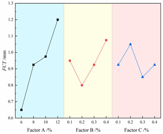 The contribution effects of three factors on FCT are illustrated in Figure 9, where the four level values of each factor are represented on the x-axis and the FCT values are indicated on the y-axis. The analysis results demonstrate that the degree of influence of each factor on FCT follows the following order: bentonite > CMC > Na2CO3. Specifically, FCT shows a significant increasing trend with rising bentonite content, while it exhibits a fluctuating pattern of initial decrease followed by increase with increasing CMC content. For Na2CO3, the FCT displays a more complex trend of increase, decrease, and subsequent increase. The range analysis in Table 8 further confirms this conclusion, with the range values ranking as follows: bentonite (R = 0.55) > CMC (R = 0.275) > Na2CO3 (R = 0.2). The range values indicate that bentonite has the most pronounced effect on FCT, with its range value approximately twice that of CMC and 2.75 times that of Na2CO3, highlighting its dominant role in regulating FCT. Although both CMC and Na2CO3 exhibit relatively minor overall effects, their complex variation trends suggest potentially significant impacts on FCT within specific concentration ranges. Ultimately, through comprehensive analysis of optimal FL and FV combinations under the constraint of maintaining FCT within the 0.5–1 mm range, the A3B2C3 formulation was identified as achieving this target thickness criterion, despite multiple formulations meeting the basic FCT engineering requirements.