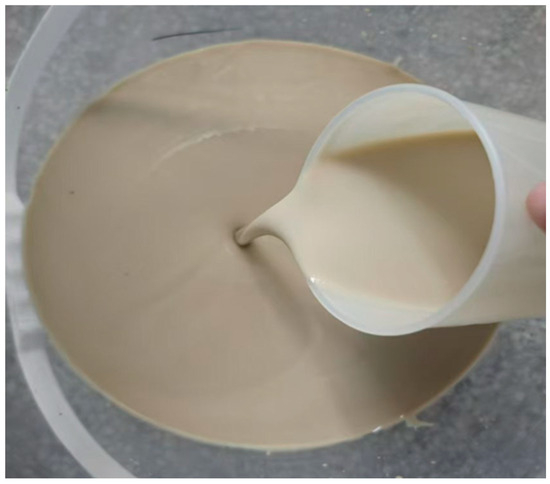 Based on orthogonal experimental results, the A3B3C4 formulation (10 wt.% bentonite, 0.3 wt.% CMC, and 0.4 wt.% Na2CO3) demonstrated compliance with all six performance criteria within the specified control ranges (pH 11.09 ≈ 11) and exhibited superior overall performance compared to the other 15 tested formulations, thereby establishing it as the optimal slurry formulation. Figure 10 shows the prepared slurry under this formulation. Notably, range analysis revealed that none of the three factors exhibited significant effects on either slurry SG or pH, and all 16 experimental groups achieved zero WSR, demonstrating that all formulations met the fundamental stability requirements. Consequently, these parameters were not subjected to further detailed analysis in this study.