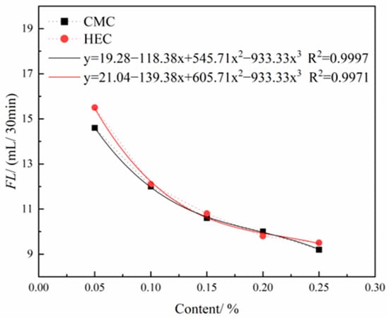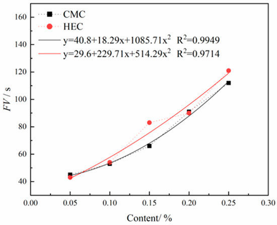 Graphs were plotted to show the variations in FV, FL, pH, and SG of the slurry with HEC and CMC contents. Polynomial fitting was applied to these curves to visualize the influence trends of both admixtures on slurry performance indicators. The comparative curves and analysis between HEC and CMC are summarized below. All fitted curves achieved R2 values greater than 0.9, indicating good model fitting.