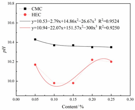As shown in Figure 13, under the same dosage conditions, the pH value of the slurry system incorporating CMC is significantly higher than that incorporating HEC. With increasing CMC dosage, the slurry pH exhibits a downward trend, while changes in HEC dosage result in a nonlinear pH variation, characterized by an initial decrease, followed by an increase, and then another decrease. Notably, throughout the entire dosage range, the pH value of the HEC slurry system remains consistently lower than that of the CMC slurry system. This discrepancy in mechanisms primarily stems from the differences in charge response characteristics in solution between non-ionic HEC and anionic CMC.