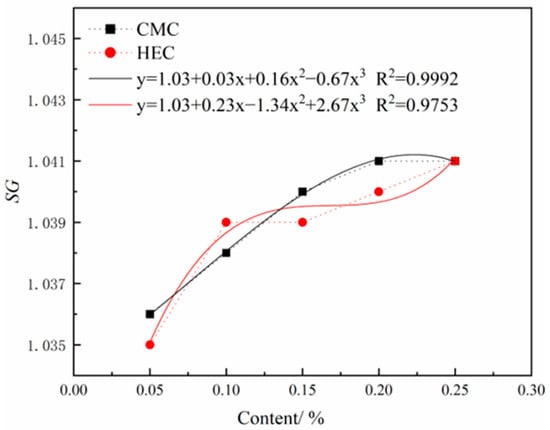 As shown in Figure 14, the incorporation of both cellulose-based admixtures exerts a certain influence on the SG regulation of the slurry system, manifested by an increase in slurry SG with the rising dosage of the admixture. This phenomenon of SG enhancement is closely related to the molecular structures of the cellulose derivatives: the hydroxyethyl groups (−CH2CH2OH) in HEC molecules and the carboxymethyl groups (−CH2COO−) in CMC molecules can form stable associations with water molecules through hydrogen bonding. Meanwhile, their long-chain molecules generate steric hindrance effects in the slurry, significantly enhancing the suspension stability of solid particles, thereby inhibiting slurry sedimentation and improving overall compactness, ultimately leading to an increase in SG.