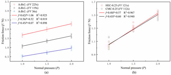 As shown in Figure 15b, when bentonite content was fixed at 8%, CMC-0.25 (FV 112 s) and HEC-0.25 (FV 121 s) showed no significant differences in either friction coefficient (0.48 vs. 0.45) or adhesion force (0.57 N vs. 0.60 N), which also conformed to theoretical expectations.