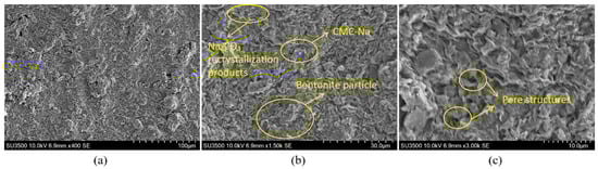 For comparative analysis, Figure 17 shows the microstructural features of the bentonite-CMC binary system for comparison. Under 400× and 1500× magnifications (Figure 17a,b), its macroscopic structure remains largely consistent with that of the Na2CO3-containing system. However, under 3000× high-resolution imaging (Figure 17c), localized agglomeration phenomena become apparent, accompanied by loosely stacked bentonite lamellae and uneven pore size distribution. This phenomenon can be attributed to the absence of two key mechanisms: (i) insufficient montmorillonite lamellar dispersion due to the lack of ion exchange induced by soda ash, and (ii) disordered entanglement of CMC molecular chains caused by charge imbalance. Such microstructural defects may lead to reduced water-retention capacity and impaired thixotropic performance.