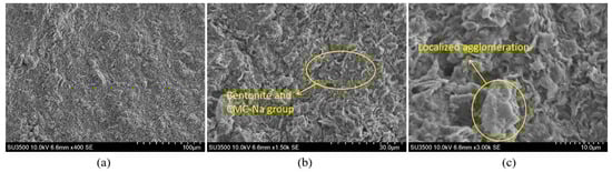 Figure 16 illustrates the microstructural morphology of the thixotropic slurry in the bentonite-CMC-Na2CO3 ternary system. Under 400× magnification (Figure 16a), the sample exhibits a typical montmorillonite lamellar stacking structure, consistent with the morphological characteristics of layered silicate minerals. When magnified to 1500× (Figure 16b), the edges of the montmorillonite lamellae become more distinct. CMC molecules are uniformly coated on the bentonite surface via electrostatic adsorption and hydrogen bonding, while micron-sized crystalline particles, identified as Na2CO3 recrystallization products, are observed at partial pores and lamellar edges. Further magnification to 3000× (Figure 16c) reveals clearly distinguishable monolayer montmorillonite structures. CMC forms a continuous wrapping network through molecular chain crosslinking, constructing a uniform organic–inorganic composite interface on the bentonite surface. The regularly distributed pore structures provide effective channels for moisture migration.