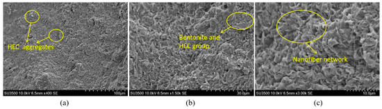 Figure 18 presents the microstructural morphology of the bentonite-HEC binary thixotropic slurry. Under 400× magnification (Figure 18a), bentonite retains its typical lamellar stacking morphology, while HEC molecular chains form localized bright white aggregates due to incomplete dispersion. Under 1500× magnification (Figure 18b), partial exfoliation of bentonite lamellae is observed, with HEC forming a thin film coating on the bentonite surface via intermolecular hydrogen bonding, exhibiting similarities to the CMC systems in Figure 13 and Figure 14. Further magnification to 3000× (Figure 18c) reveals three critical structural features: (i) HEC forming a continuous nanofiber network uniformly coating the bentonite surface and extending into interlayer spaces; and (ii) uniform overall pore distribution interspersed with localized fiber fractures and agglomerations. This composite structure endows the material with pronounced thixotropic properties through synergistic hydrogen-bonded networks and physical entanglement.