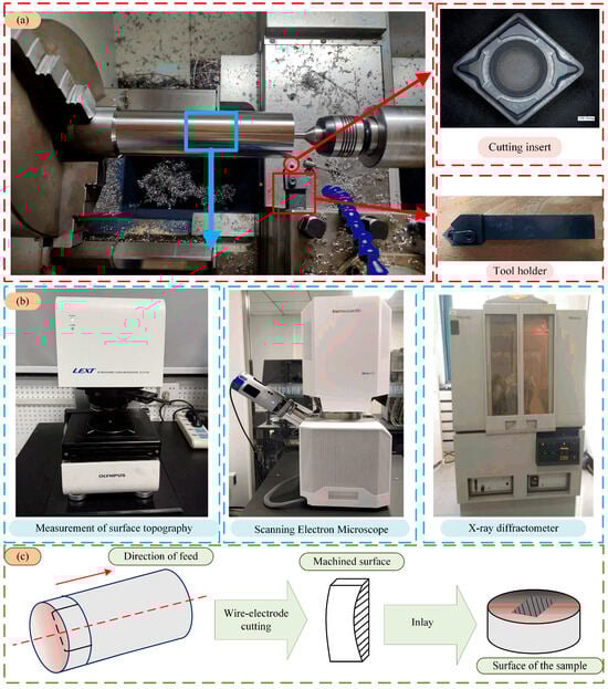 A laser confocal scanning microscope (LSCM, LEXT OLS4100) was used to observe the surface morphology, roughness, and microstructure. To deeply explore the microstructure of the metamorphic layer on the machined surface, the machined workpiece was further processed to prepare the metallographic sample, and the preparation process is shown in Figure 1c. The field emission scanning electron microscope (SEM) model Apreo 2C, produced by Thermo Fisher Technology Co., Ltd. (Shanghai, China), was used to observe the surface morphology after slicing. In addition, X-ray diffraction (XRD) analysis of the surface layer was carried out using an X-ray diffractometer (Cu-Kα radiation) produced by Philips of the Netherlands to evaluate the surface phase transformation.