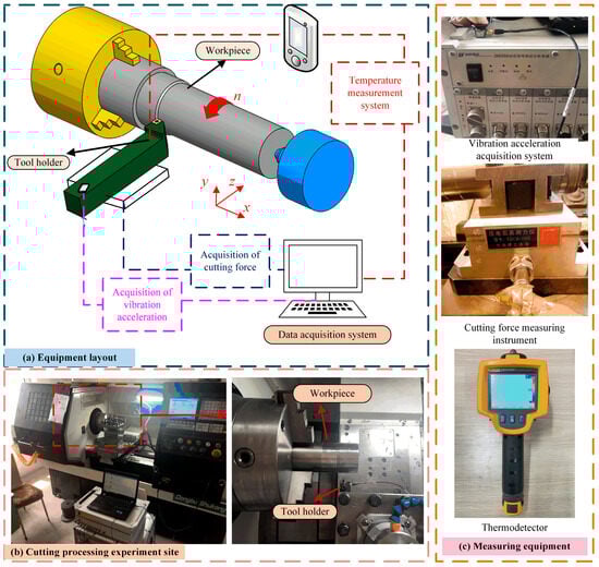 During the dry-cutting experiment, the cutting process parameters were monitored. The layout of the monitoring equipment is shown in Figure 2a. During the cutting process, experiments were conducted using a three-phase cutting force measuring instrument, a cutting displacement sensor, and an infrared thermal imager. The experimental equipment is shown in Figure 2c, and the experimental plan is presented in Table 1.
